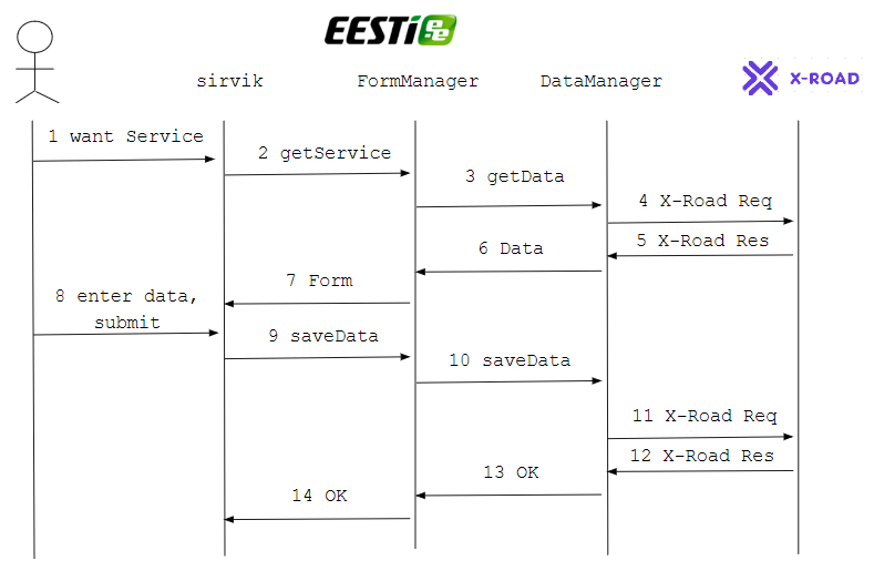 FormManager koostab andmete salvestamise X-tee päringu(d) ja saadab need asjakohas(t)esse andmekogu(de)sse. | X-Road, SOAP, WSDL |